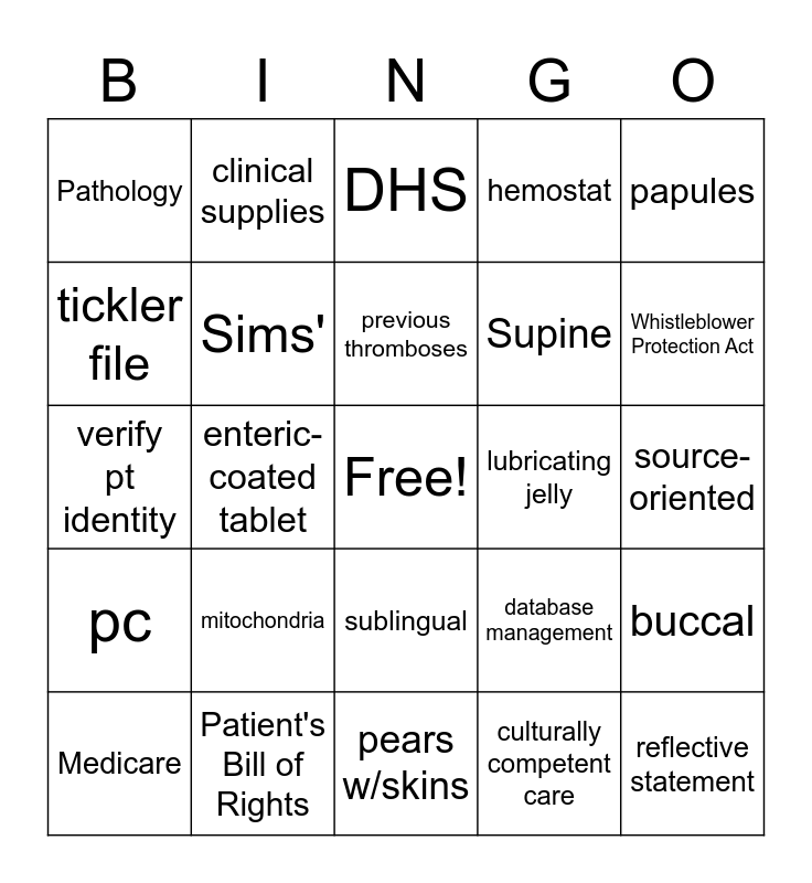 This bingo card has a free space and 60 words: Diagnosis code, Patient's Bill of Rights, Nitroglycerin, pc, culturally competent care, Dorsal recumbent, Sims', Lithotomy, Supine, fungal, hemostat, pulmonary function test, tickler file, don gloves, airborne, Pathology, reflective statement, papules, holter monitor, previous thromboses, lubricating jelly, DHS, Medicare, buccal, IM, stage II HTN, herpes simplex I, OSHA form 301, Whistleblower Protection Act, depression, SQ, tongue blade, fentanyl patches, Home Health Care, clinical supplies, chlorohexidine, red biohazard bag, enteric-coated tablet, scabies, verify pt identity, cilia, mitochondria, source-oriented, rapid strep, database management, cerebrum, pulse oximetry, anorexia nervosa, transdermal, sublingual, pears w/skins, regular waste container, cholesterol level, durable power of attorney, cluster scheduling, wave scheduling, syncope, open hours scheduling, chicken pox and intradermal.