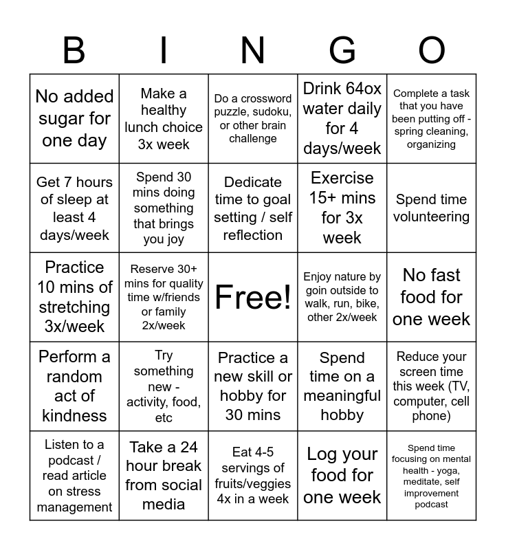 This bingo card has a free space and 24 words: Try something new - activity, food, etc, Take a 24 hour break from social media, Dedicate time to goal setting / self reflection, Listen to a podcast / read article on stress management, Complete a task that you have been putting off - spring cleaning, organizing, No added sugar for one day, Get 7 hours of sleep at least 4 days/week, Make a healthy lunch choice 3x week, Enjoy nature by goin outside to walk, run, bike, other 2x/week, Practice a new skill or hobby for 30 mins, Exercise 15+ mins for 3x week, Practice 10 mins of stretching 3x/week, Spend time on a meaningful hobby, Reduce your screen time this week (TV, computer, cell phone), Spend 30 mins doing something that brings you joy, Log your food for one week, No fast food for one week, Do a crossword puzzle, sudoku, or other brain challenge, Spend time volunteering, Reserve 30+ mins for quality time w/friends or family 2x/week, Spend time focusing on mental health - yoga, meditate, self improvement podcast, Perform a random act of kindness, Drink 64ox water daily for 4 days/week and Eat 4-5 servings of fruits/veggies 4x in a week.