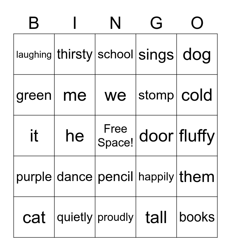 This bingo card has a free space and 24 words: dance, quietly, we, cat, dog, laughing, green, thirsty, door, pencil, stomp, it, happily, them, me, tall, fluffy, school, cold, he, books, purple, sings and proudly.