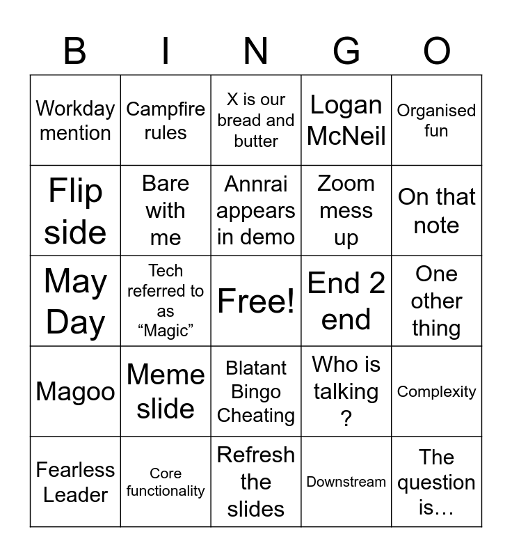 This bingo card has a free space and 27 words: Who is talking ?, Scale up, Zoom mess up, Refresh the slides, Flip side, X is our bread and butter, Campfire rules, Magoo, End 2 end, Complexity, May Day, Logan McNeil, Fearless Leader, Core functionality, On that note, Kick off, Bare with me, Annrai appears in demo, Meme slide, Workday mention, One other thing, Downstream, Tech referred to as “Magic”, The question is…, Blatant Bingo Cheating, Organised fun and Covid arms.