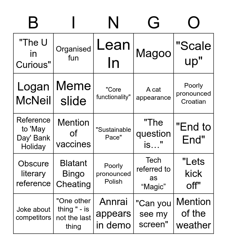 This bingo card has 48 words: Free!, "Sustainable Pace", Fearless Leader, Annrai appears in demo, Blatant Bingo Cheating, "On that note", Organised fun, "our bread and butter", Logan McNeil, Covid arms, Meme slide, Magoo, "Lets kick off", Tech referred to as “Magic”, Zoom tech issues, "Who is presenting?", "Core functionality", "The question is…", "Campfire rules", "Scale up", Mention of vaccines, "Can you see my screen", "The U in Curious", A cat appearance, A dog appearance, Poorly pronounced Croatian, Joke about competitors, Annrai's sermon, Poorly pronounced Polish, Obscure literary reference, Name mixup, "You're on mute", Demo Oopsie, Test Worker, "One other thing " - is not the last thing, "We have a lot to get through", "Bear with me", "End to End", "Downstream", Mention of Lockdown Ending, "Project Tahiti", Mention of the weather, Lean In, Single source of truth, Reference to 'May Day' Bank Holiday, Paddy bigs up founder of Gitlab 'Sid Sijbrandij, "Security Posture" and SOC Audit.
