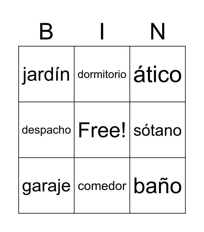 This bingo card has a free space and 11 words: cocina, comedor, baño, garaje, dormitorio, ático, sótano, escalera, despacho, jardín and patio.