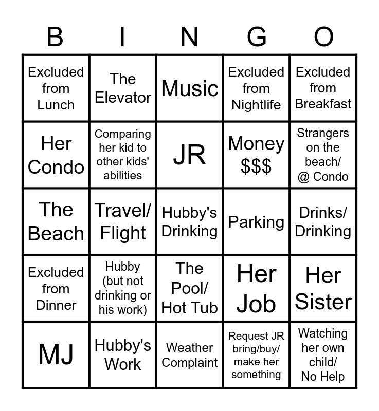This bingo card has 25 words: Hubby (but not drinking or his work), Weather Complaint, JR, MJ, Excluded from Breakfast, Excluded from Lunch, Her Condo, The Elevator, Parking, The Pool/ Hot Tub, Money $$$, The Beach, Her Job, Her Sister, Comparing her kid to other kids' abilities, Watching her own child/ No Help, Drinks/ Drinking, Music, Strangers on the beach/ @ Condo, Travel/ Flight, Hubby's Drinking, Hubby's Work, Excluded from Dinner, Excluded from Nightlife and Request JR bring/buy/ make her something.