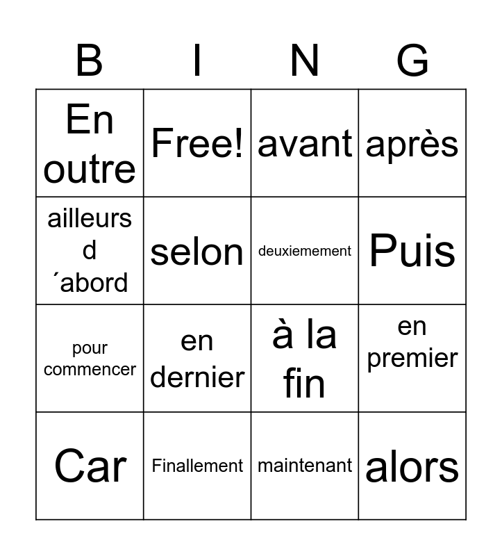 This bingo card has 16 words: Finallement, en premier, avant, En outre, pour commencer, Free!, à la fin, maintenant, ailleurs d´abord, selon, Car, après, en dernier, Puis, deuxiemement and alors.