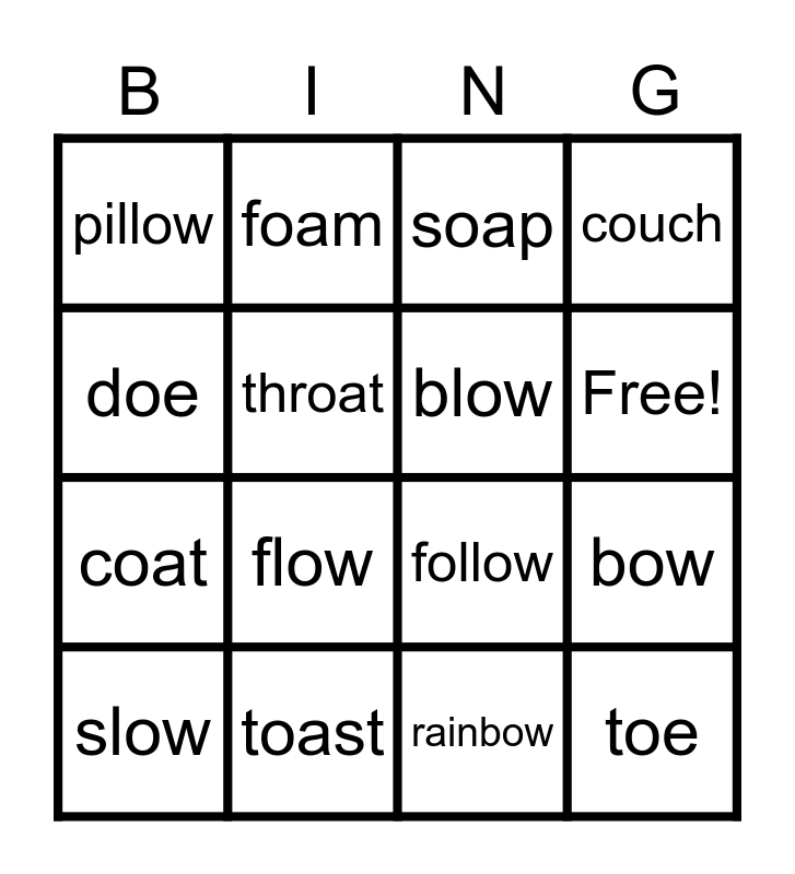 This bingo card has 17 words: rainbow, slow, soap, pillow, flow, couch, bow, blow, Free!, throat, toast, follow, doe, foam, coat, bowl and toe.