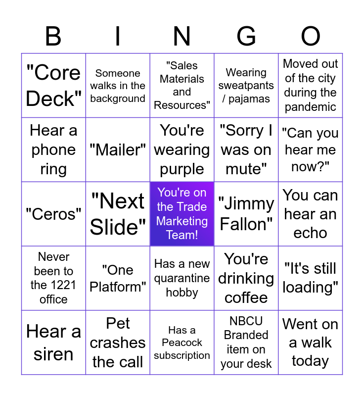 This bingo card has a free space and 24 words: "One Platform", Pet crashes the call, You're wearing purple, Hear a siren, Moved out of the city during the pandemic, "Core Deck", Hear a phone ring, Someone walks in the background, "Jimmy Fallon", Has a new quarantine hobby, "Sorry I was on mute", "Ceros", You're drinking coffee, "It's still loading", "Mailer", NBCU Branded item on your desk, You can hear an echo, "Sales Materials and Resources", "Can you hear me now?", "Next Slide", Went on a walk today, Never been to the 1221 office, Wearing sweatpants / pajamas and Has a Peacock subscription.