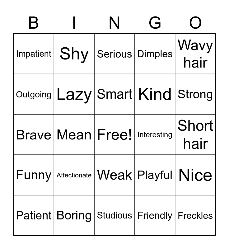 This bingo card has a free space and 24 words: Affectionate, Boring, Smart, Patient, Wavy hair, Impatient, Outgoing, Shy, Interesting, Weak, Kind, Brave, Playful, Nice, Lazy, Friendly, Short hair, Serious, Strong, Mean, Freckles, Funny, Dimples and Studious.