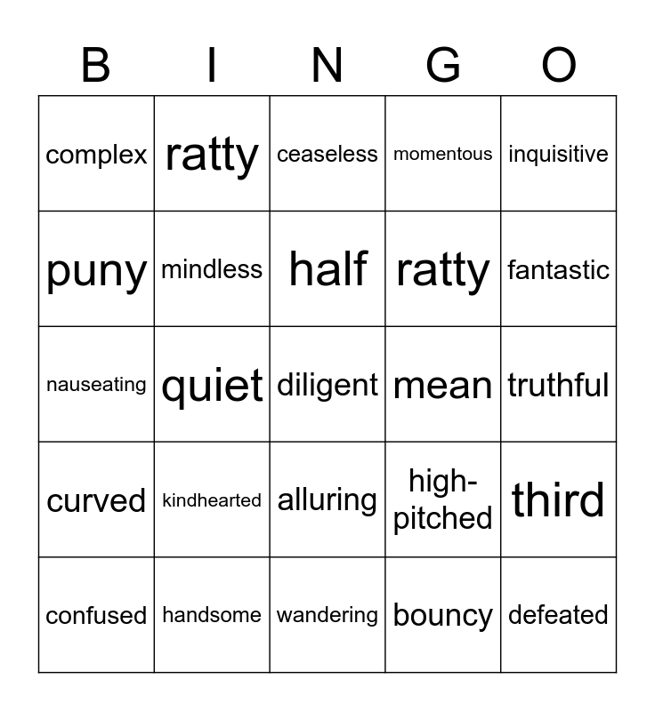 This bingo card has 30 words: handsome, forgetful, quiet, watery, complex, ceaseless, mindless, alluring, mean, wandering, truthful, diligent, bouncy, defeated, fantastic, superficial, high-pitched, curved, kindhearted, inquisitive, nauseating, wasteful, ratty, ratty, puny, momentous, third, confused, half and talented.
