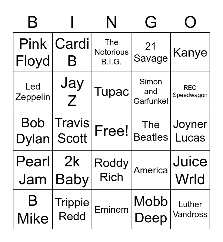 This bingo card has a free space and 24 words: 2k Baby, Trippie Redd, Tupac, B Mike, Kanye, Pink Floyd, Led Zeppelin, Cardi B, The Beatles, Roddy Rich, Simon and Garfunkel, Bob Dylan, America, Juice Wrld, Jay Z, Mobb Deep, Joyner Lucas, The Notorious B.I.G., REO Speedwagon, Travis Scott, Luther Vandross, Pearl Jam, 21 Savage and Eminem.