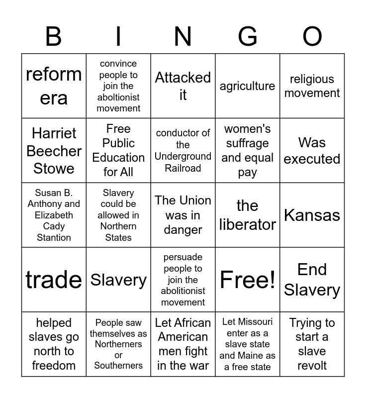 This bingo card has 25 words: Slavery, Let African American men fight in the war, conductor of the Underground Railroad, helped slaves go north to freedom, religious movement, reform era, Harriet Beecher Stowe, convince people to join the aboltionist movement, the liberator, persuade people to join the abolitionist movement, women's suffrage and equal pay, Susan B. Anthony and Elizabeth Cady Stantion, Free!, End Slavery, Free Public Education for All, Trying to start a slave revolt, Kansas, Attacked it, Was executed, Slavery could be allowed in Northern States, The Union was in danger, People saw themselves as Northerners or Southerners, trade, agriculture and Let Missouri enter as a slave state and Maine as a free state.