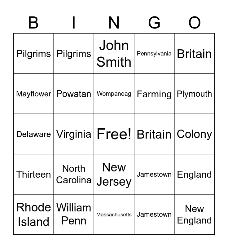 ⚠ This card has duplicate items: Pilgrims (2), Britain (2), Jamestown (2)