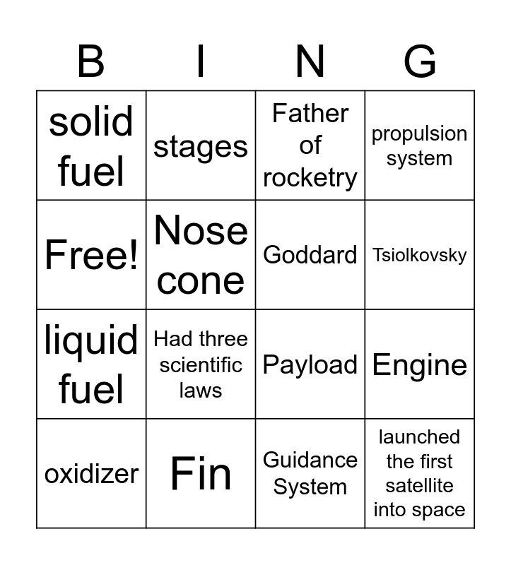 This bingo card has 16 words: Fin, Engine, Father of rocketry, solid fuel, liquid fuel, stages, Payload, Guidance System, Free!, Nose cone, oxidizer, propulsion system, Had three scientific laws, Tsiolkovsky, Goddard and launched the first satellite into space.