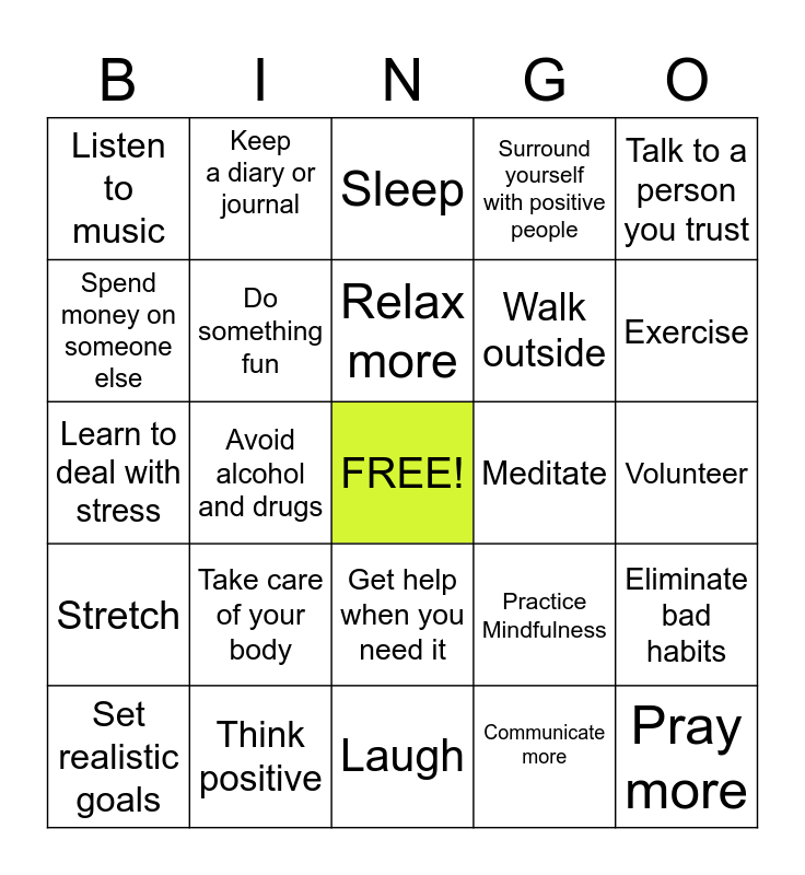 This bingo card has a free space and 24 words: Take care of your body, Think positive, Relax more, Set realistic goals, Talk to a person you trust, Listen to music, Spend money on someone else, Keep a diary or journal, Meditate, Get help when you need it, Walk outside, Learn to deal with stress, Practice Mindfulness, Eliminate bad habits, Do something fun, Communicate more, Volunteer, Sleep, Exercise, Avoid alcohol and drugs, Pray more, Stretch, Surround yourself with positive people and Laugh.
