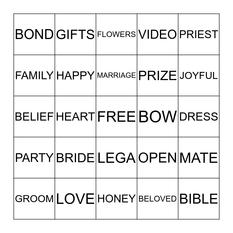 This bingo card has a free space and 24 words: BRIDE, LOVE, MARRIAGE, GROOM, PRIEST, BOND, FAMILY, GIFTS, BOW, LEGA, PRIZE, BELIEF, OPEN, MATE, HAPPY, BELOVED, DRESS, FLOWERS, JOYFUL, HEART, BIBLE, PARTY, VIDEO and HONEY.