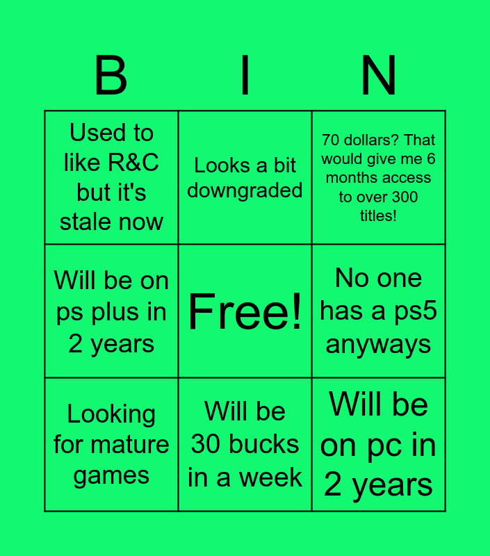 This bingo card has a free space and 8 words: No one has a ps5 anyways, 70 dollars? That would give me 6 months access to over 300 titles!, Looks a bit downgraded, Looking for mature games, Used to like R&C but it's stale now, Will be on pc in 2 years, Will be on ps plus in 2 years and Will be 30 bucks in a week.
