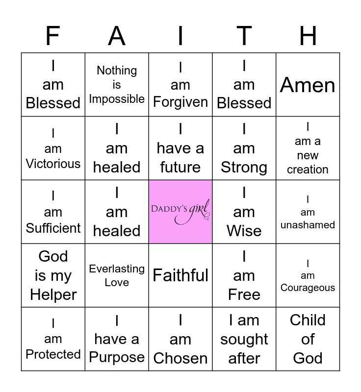 This bingo card has a free space and 27 words: I am Free, I am Loved, I am Strong, I am Chosen, I am Victorious, I am Forgiven, Nothing is Impossible, God is my Helper, I am Wise, I am Courageous, I am Sufficient, I am Blessed, I am Protected, I have a Purpose, I am a new creation, I am wonderfully made, I am healed, I have a future, Everlasting Love, I am Blessed, I am unashamed, I am sought after, I am healed, Child of God, Faithful, Amen and Crown.