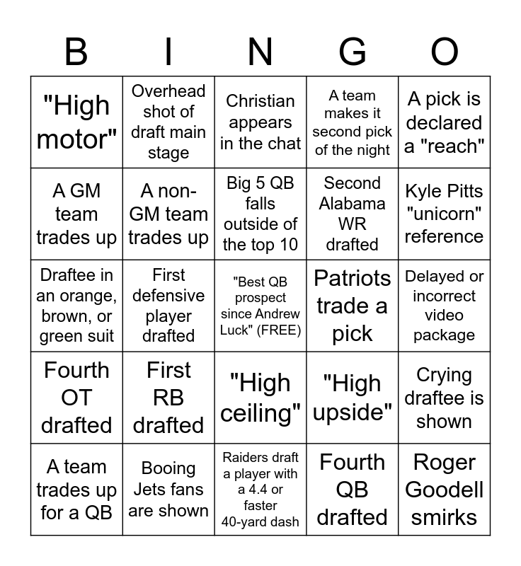 This bingo card has a free space and 24 words: A team trades up for a QB, First RB drafted, Big 5 QB falls outside of the top 10, Fourth QB drafted, A pick is declared a "reach", "High motor", Overhead shot of draft main stage, Christian appears in the chat, Patriots trade a pick, Delayed or incorrect video package, Draftee in an orange, brown, or green suit, A non-GM team trades up, "High upside", Crying draftee is shown, A GM team trades up, Booing Jets fans are shown, Raiders draft a player with a 4.4 or faster 40-yard dash, A team makes it second pick of the night, Kyle Pitts "unicorn" reference, Fourth OT drafted, First defensive player drafted, "High ceiling", Second Alabama WR drafted and Roger Goodell smirks.
