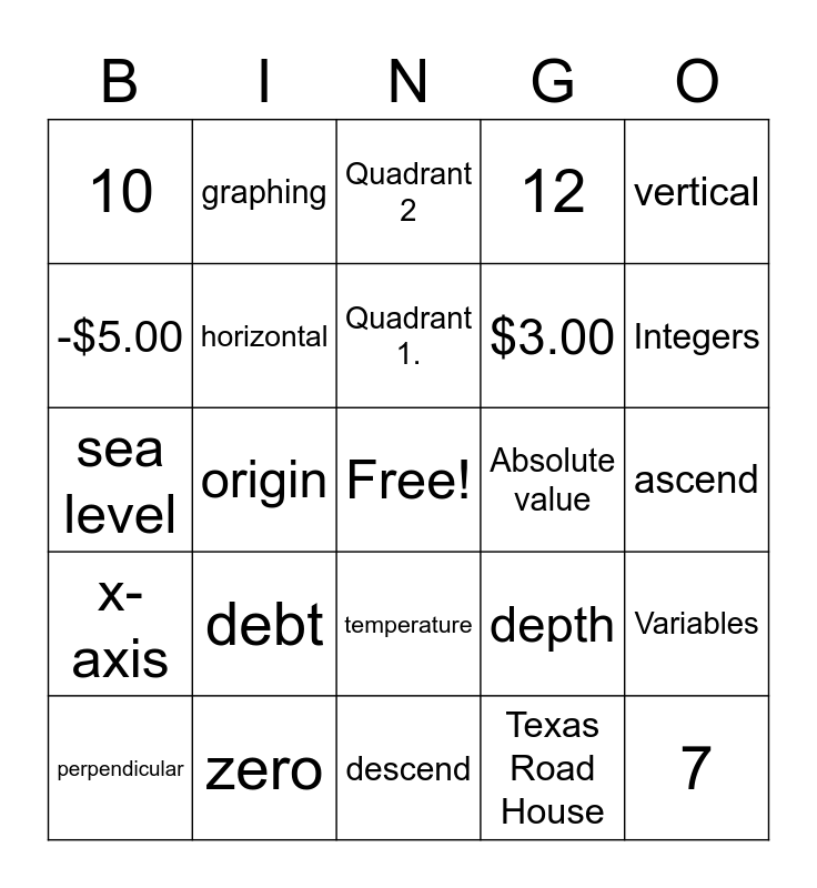 This bingo card has a free space and 33 words: coordinate grid, coordinates, origin, y-axis, x-axis, horizontal, vertical, perpendicular, graphing, plot, Quadrant 1., Quadrant 2, Quadrant 4, Quadrant 3, Absolute value, Integers, zero, sea level, debt, depth, temperature, 8, 10, ascend, descend, 7, 12, $3.00, -$5.00, Variables, Cloud, Texas Road House and Arizona Wildcats.