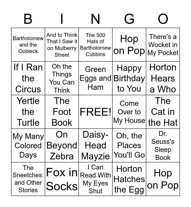 This bingo card has a free space and 24 words: On Beyond Zebra, Fox in Socks, Green Eggs and Ham, The Sneetches: and Other Stories, There's a Wocket in My Pocket, Bartholomew and the Oobleck, If I Ran the Circus, And to Think That I Saw it on Mulberry Street, Come Over to My House, Daisy-Head Mayzie, Happy Birthday to You, Yertle the Turtle, Oh, the Places You'll Go, Dr. Seuss's Sleep Book, Oh the Things You Can Think, Horton Hatches the Egg, The Cat in the Hat, The 500 Hats of Bartholomew Cubbins, Horton Hears a Who, The Foot Book, Hop on Pop, My Many Colored Days, Hop on Pop and I Can Read With My Eyes Shut.