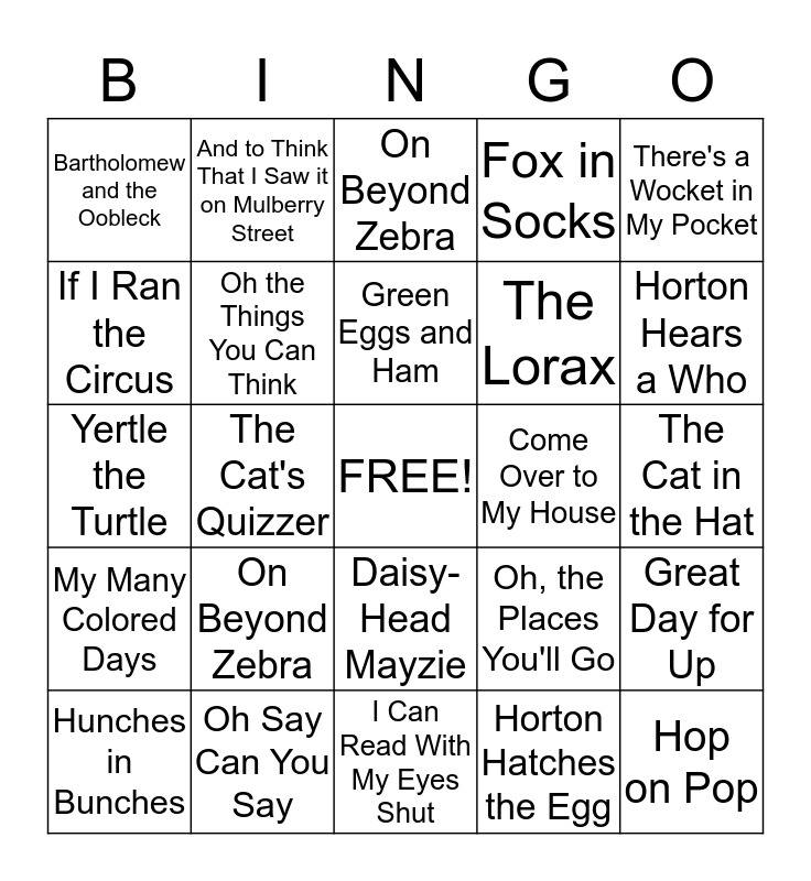 This bingo card has a free space and 24 words: On Beyond Zebra, Oh Say Can You Say, Green Eggs and Ham, Hunches in Bunches, There's a Wocket in My Pocket, Bartholomew and the Oobleck, If I Ran the Circus, And to Think That I Saw it on Mulberry Street, Come Over to My House, Daisy-Head Mayzie, The Lorax, Yertle the Turtle, Oh, the Places You'll Go, Great Day for Up, Oh the Things You Can Think, Horton Hatches the Egg, The Cat in the Hat, On Beyond Zebra, Horton Hears a Who, The Cat's Quizzer, Hop on Pop, My Many Colored Days, Fox in Socks and I Can Read With My Eyes Shut.
