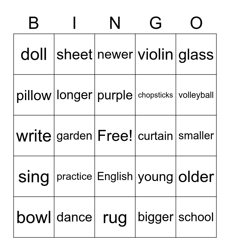 This bingo card has a free space and 25 words: practice, rug, purple, bowl, glass, doll, pillow, sheet, curtain, English, chopsticks, write, young, older, longer, taller, smaller, newer, volleyball, garden, school, dance, sing, violin and bigger.