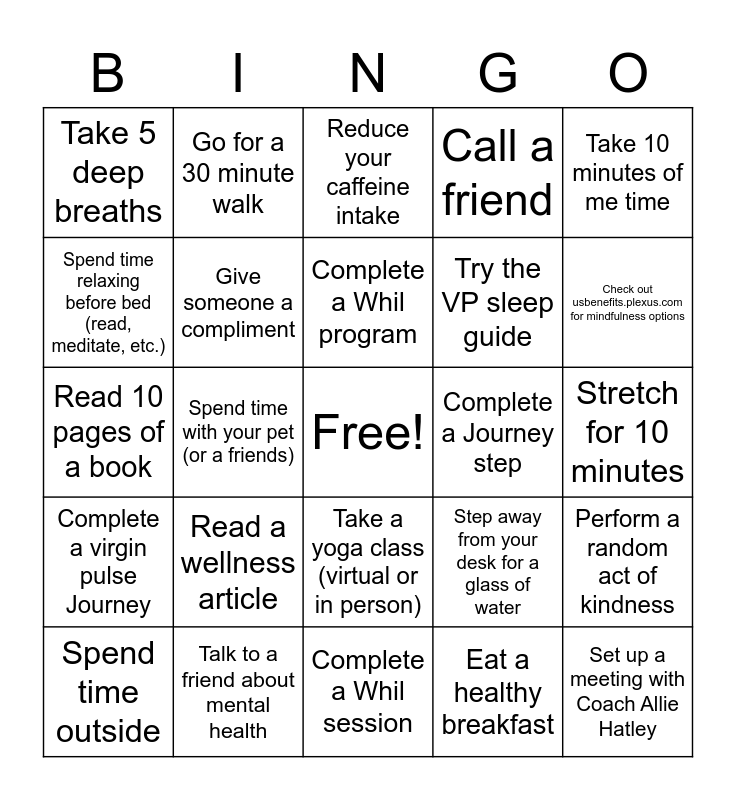 This bingo card has a free space and 24 words: Read a wellness article, Talk to a friend about mental health, Complete a Whil program, Spend time outside, Take 10 minutes of me time, Take 5 deep breaths, Spend time relaxing before bed (read, meditate, etc.), Go for a 30 minute walk, Complete a Journey step, Take a yoga class (virtual or in person), Try the VP sleep guide, Read 10 pages of a book, Step away from your desk for a glass of water, Perform a random act of kindness, Give someone a compliment, Eat a healthy breakfast, Stretch for 10 minutes, Reduce your caffeine intake, Check out usbenefits.plexus.com for mindfulness options, Spend time with your pet (or a friends), Set up a meeting with Coach Allie Hatley, Complete a virgin pulse Journey, Call a friend and Complete a Whil session.