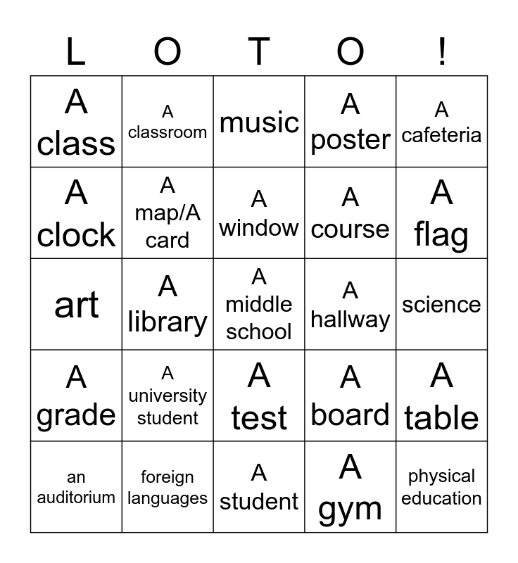 This bingo card has 46 words: A school, A middle school, A high school, A student, A university student, A teacher, A classroom, A classmate, A clock, A chair, A map/A card, A poster, A table, A board, a smart board, a wastebasket, A window, A hallway, A locker, A cafeteria, A library, A gym, A class, A course, A lesson, A flag, an auditorium, An office/A desk, A test, A grade, English, History, literature, computer science, math, foreign languages, science, geography, biology, chemistry, physical education, music, art, theater, recess and study hall.
