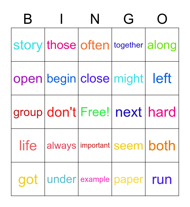 This bingo card has a free space and 24 words: always, under, close, got, along, story, open, those, next, important, might, group, seem, both, begin, paper, hard, often, left, don't, run, life, together and example.
