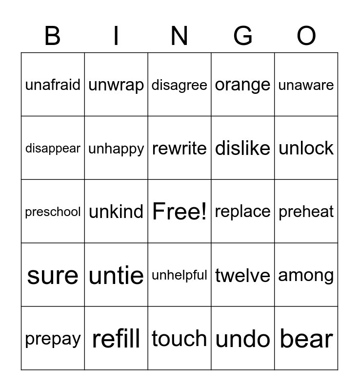 This bingo card has a free space and 24 words: untie, refill, rewrite, prepay, unaware, unafraid, disappear, unwrap, replace, unhelpful, dislike, preschool, twelve, among, unhappy, undo, preheat, disagree, unlock, unkind, bear, sure, orange and touch.