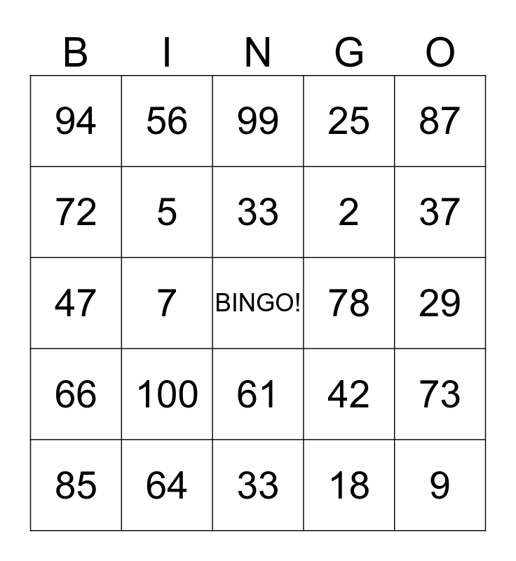 This bingo card has a free space and 24 words: 100, 64, 33, 85, 87, 94, 72, 56, 78, 61, 2, 47, 42, 73, 5, 18, 29, 99, 37, 7, 9, 66, 25 and 33.
