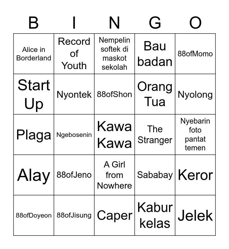 This bingo card has a free space and 24 words: 88ofJeno, 88ofJisung, 88ofShon, 88ofDoyeon, 88ofMomo, Alice in Borderland, Start Up, Record of Youth, The Stranger, A Girl from Nowhere, Orang Tua, Plaga, Sababay, Keror, Nyontek, Kabur kelas, Nyebarin foto pantat temen, Nempelin softek di maskot sekolah, Nyolong, Ngebosenin, Jelek, Alay, Bau badan and Caper.