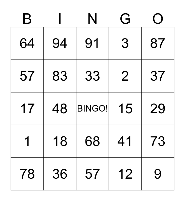 This bingo card has a free space and 24 words: 18, 36, 33, 78, 87, 64, 57, 94, 15, 68, 2, 17, 41, 73, 83, 12, 29, 91, 37, 48, 9, 1, 3 and 57.