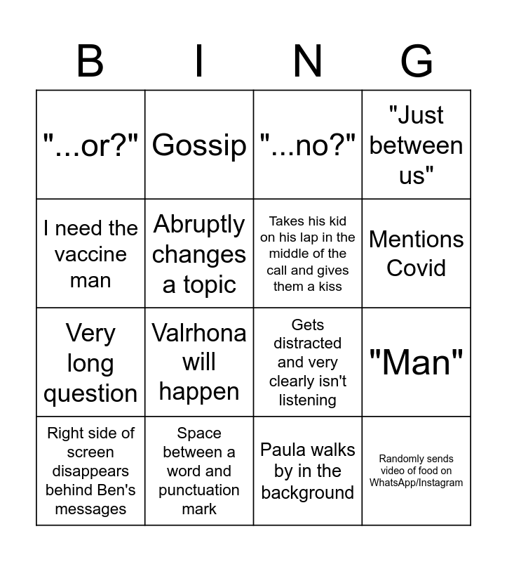 This bingo card has 16 words: Space between a word and punctuation mark, "Man", "...no?", "...or?", Very long question, Gossip, Gets distracted and very clearly isn't listening, Paula walks by in the background, I need the vaccine man, Abruptly changes a topic, Right side of screen disappears behind Ben's messages, "Just between us", Valrhona will happen, Mentions Covid, Takes his kid on his lap in the middle of the call and gives them a kiss and Randomly sends video of food on WhatsApp/Instagram.