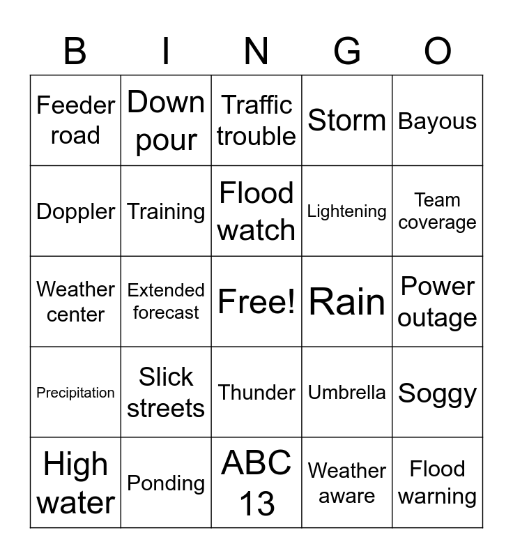 This bingo card has a free space and 24 words: Slick streets, Ponding, Flood watch, High water, Bayous, Feeder road, Doppler, Down pour, Rain, Thunder, Lightening, Weather center, Umbrella, Soggy, Training, Weather aware, Power outage, Traffic trouble, Team coverage, Extended forecast, Flood warning, Precipitation, Storm and ABC 13.
