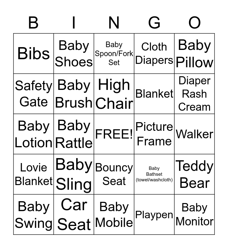 This bingo card has a free space and 24 words: Baby Sling, Car Seat, High Chair, Baby Swing, Baby Pillow, Bibs, Safety Gate, Baby Shoes, Picture Frame, Bouncy Seat, Blanket, Baby Lotion, Baby Bathset (towel/washcloth), Teddy Bear, Baby Brush, Playpen, Walker, Baby Spoon/Fork Set, Diaper Rash Cream, Baby Rattle, Baby Monitor, Lovie Blanket, Cloth Diapers and Baby Mobile.