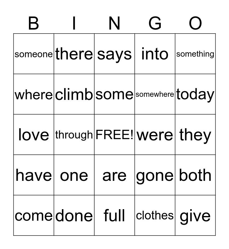 This bingo card has a free space and 24 words: one, done, some, come, something, someone, where, there, were, are, somewhere, love, gone, both, climb, clothes, they, says, today, through, give, have, into and full.