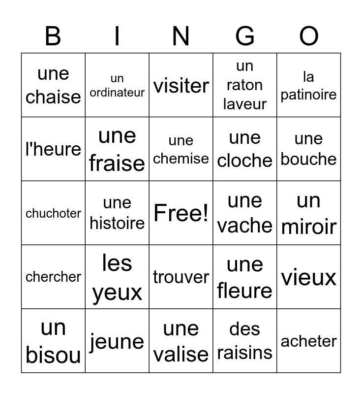 This bingo card has a free space and 24 words: un bisou, les yeux, une chemise, des raisins, la patinoire, une chaise, un ordinateur, visiter, une vache, un miroir, chuchoter, une fraise, une fleure, vieux, l'heure, jeune, une valise, un raton laveur, une bouche, chercher, une histoire, trouver, une cloche and acheter.