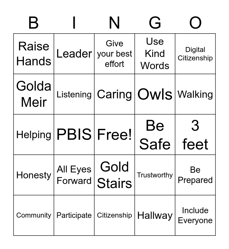 This bingo card has a free space and 36 words: Respect, Responsible, Empathy, Listening, Trustworthy, Honesty, Caring, Relationships, Digital Citizenship, Fair, PBIS, Use Kind Words, Mute, Be Safe, Walking, Raise Hands, Wash Hands, All Eyes Forward, Include Everyone, Give your best effort, 3 feet, Be Prepared, Participate, Community, Citizenship, Leader, Helping, Hands to self, Owls, Golda Meir, Playground, Lunchroom, Hallway, Gold Stairs, Blue Stairs and Red Stairs.