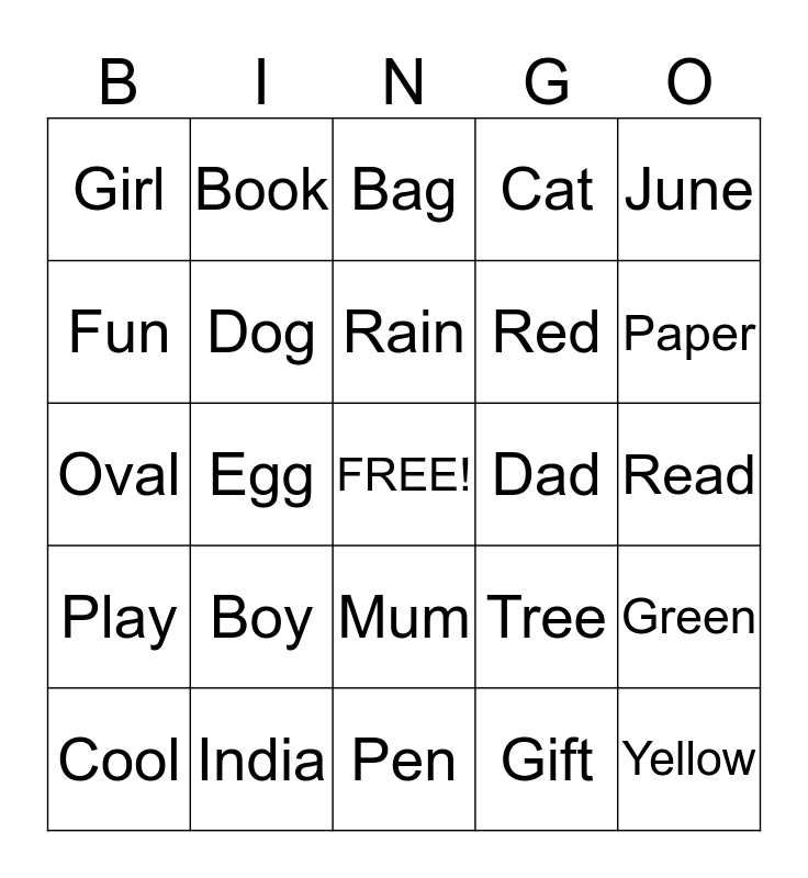 This bingo card has a free space and 24 words: Boy, India, Rain, Cool, June, Girl, Fun, Book, Dad, Mum, Red, Oval, Tree, Green, Dog, Gift, Read, Bag, Paper, Egg, Yellow, Play, Cat and Pen.