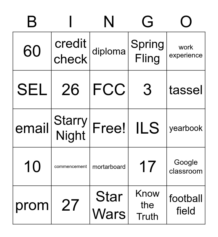 This bingo card has a free space and 24 words: commencement, 27, FCC, prom, work experience, 60, SEL, credit check, ILS, mortarboard, 3, email, 17, Google classroom, 26, Know the Truth, yearbook, diploma, tassel, Starry Night, football field, 10, Spring Fling and Star Wars.