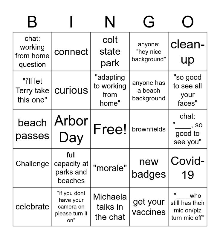 This bingo card has a free space and 33 words: hugs, "hard work over the past year", Arbor Day, 5C week, Challenge, curious, clean-up, celebrate, connect, specific clean ups, "adapting to working from home", colt state park, free fishing day, continuing inspections, brownfields, "so good to see all your faces", "if you dont have your camera on please turn it on", beach passes, full capacity at parks and beaches, new badges, "morale", "____ you're muted", chat: working from home question, chat: "____, so good to see you", Michaela talks in the chat, "____who still has their mic on/plz turn mic off", anyone: "hey nice background", anyone has a beach background, "i'll let Terry take this one", Covid-19, someone makes a "cringe" joke, get your vaccines and "im so proud of all we've accomplished".