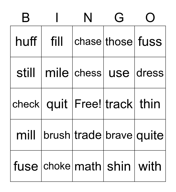 This bingo card has a free space and 34 words: shine, shin, trick, trike, mill, mile, fuss, fuse, fill, file, chess, chase, bass, base, track, dress, choke, check, brush, brave, trade, life, huff, thin, math, with, those, joke, use, still, stole, quit, quite and fluke.