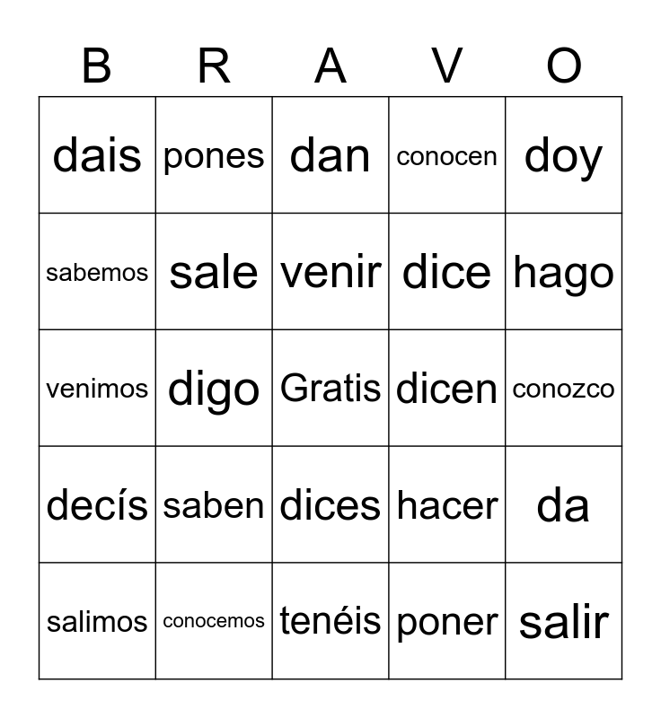 This bingo card has a free space and 70 words: conocer, conozco, conoces, conoce, conocemos, conocéis, conocen, dar, doy, das, da, damos, dais, dan, decir, digo, dices, dice, decimos, decís, dicen, hacer, hago, haces, hace, hacemos, hacéis, hacen, poner, pongo, pones, pone, ponemos, ponéis, ponen, saber, sé, sabes, sabe, sabemos, sabéis, saben, salir, salgo, sales, sale, salimos, salís, salen, tener, tengo, tienes, tiene, tenemos, tenéis, tienen, venir, vengo, vienes, viene, venimos, venís, vienen, ver, veo, ves, ve, vemos, veis and ven.