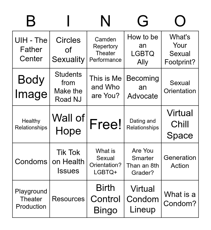 This bingo card has a free space and 27 words: Are You Smarter Than an 8th Grader?, Artwork, Becoming an Advocate, Birth Control Bingo, Body Image, Camden Repertory Theater Performance, Circles of Sexuality, Condoms, Dating and Relationships, Generation Action, Healthy Relationships, How to be an LGBTQ Ally, Playground Theater Production, Resources, Sexual Orientation, STD Testing and How to Know, Students from Make the Road NJ, This is Me and Who are You?, Tik Tok on Health Issues, UIH - The Father Center, Virtual Chill Space, Virtual Condom Lineup, Wall of Hope, What is a Condom?, What is Sexual Orientation? LGBTQ+, What's Your Sexual Footprint? and Zines - Self Care.