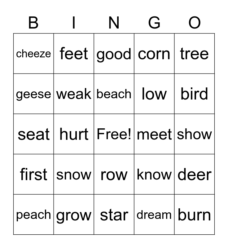 This bingo card has a free space and 24 words: snow, grow, beach, peach, tree, cheeze, geese, feet, meet, row, low, seat, know, deer, weak, dream, show, good, bird, hurt, burn, first, corn and star.