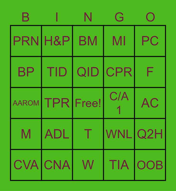 This bingo card has a free space and 24 words: ADL, CNA, QID, CVA, PC, PRN, BP, H&P, C/A 1, T, CPR, AAROM, WNL, Q2H, TID, TIA, AC, BM, F, TPR, OOB, M, MI and W.