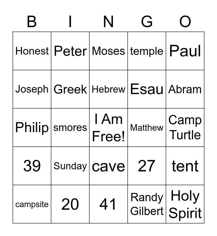 This bingo card has a free space and 34 words: Obedient, Randy Gilbert, Karl Fleig, Missouri, 39, Greek, Paul, campsite, Peter, Loyal, Hebrew, Moses, Jesus, Wednesday, Matthew, Abram, 20, Philip, Sunday, 27, cave, 19, Honest, Camp Turtle, 41, Holy Spirit, temple, Jerusalem, Esau, Joseph, Spiritual, smores, tent and compass.