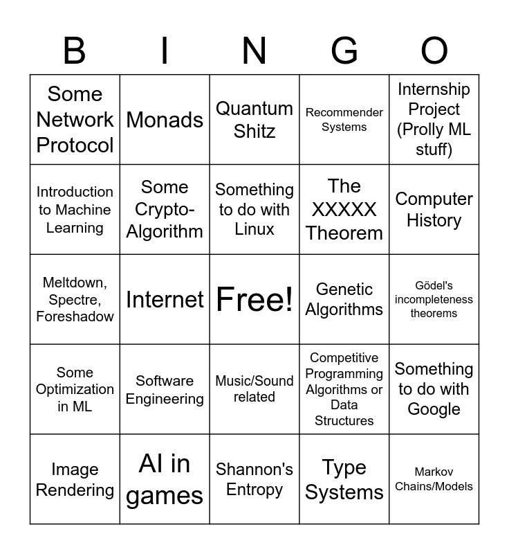 This bingo card has a free space and 24 words: Software Engineering, AI in games, Something to do with Linux, Image Rendering, Internship Project (Prolly ML stuff), Some Network Protocol, Introduction to Machine Learning, Monads, Genetic Algorithms, Music/Sound related, The XXXXX Theorem, Meltdown, Spectre, Foreshadow, Competitive Programming Algorithms or Data Structures, Something to do with Google, Some Crypto-Algorithm, Type Systems, Gödel's incompleteness theorems, Quantum Shitz, Computer History, Internet, Markov Chains/Models, Some Optimization in ML, Recommender Systems and Shannon's Entropy.