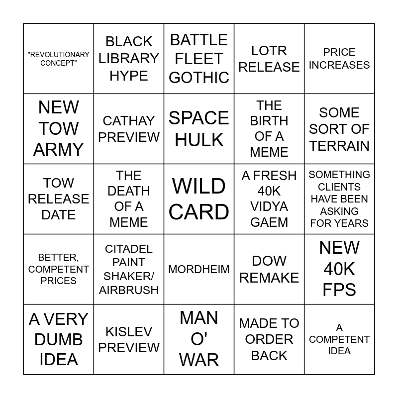 This bingo card has a free space and 24 words: A VERY DUMB IDEA, CITADEL PAINT SHAKER/ AIRBRUSH, SPACE HULK, MADE TO ORDER BACK, PRICE INCREASES, "REVOLUTIONARY CONCEPT", BLACK LIBRARY HYPE, BATTLE FLEET GOTHIC, A FRESH 40K VIDYA GAEM, SOMETHING CLIENTS HAVE BEEN ASKING FOR YEARS, TOW RELEASE DATE, CATHAY PREVIEW, DOW REMAKE, NEW 40K FPS, NEW TOW ARMY, KISLEV PREVIEW, MAN O' WAR, LOTR RELEASE, SOME SORT OF TERRAIN, BETTER, COMPETENT PRICES, THE DEATH OF A MEME, MORDHEIM, THE BIRTH OF A MEME and A COMPETENT IDEA.