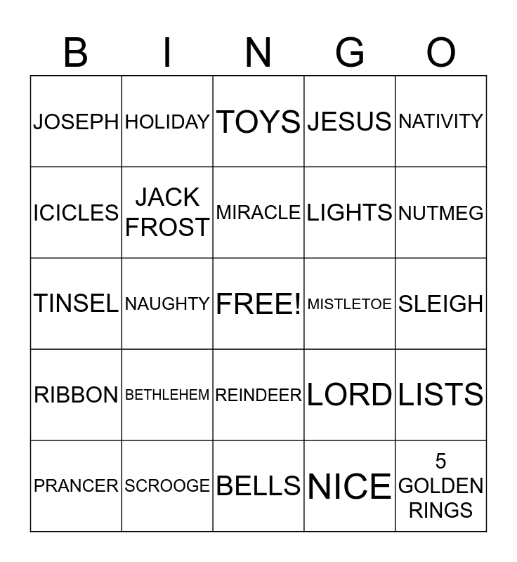 This bingo card has a free space and 49 words: 3 WISEMEN, 5 GOLDEN RINGS, ANGEL, BELLS, BETHLEHEM, GREETINGS, HOLIDAY, HOLLY, ICICLES, INN, JACK FROST, JESUS, LISTS, LORD, MARY, MERRY, MIRACLE, MISTLETOE, MYRRH, NATIVITY, NAUGHTY, NICE, JOSEPH, LIGHTS, NOEL, NUTMEG, PRANCER, PRESENTS, REINDEER, RIBBON, RUDOLPH, SACK, SALES, SANTA, SCROOGE, SHEPHERDS, SHOPPING, SINGING, SLEIGH, SNOWMAN, STABLE, STAR, STOCKINGS, TIDINGS, TINSEL, TOYS, WORSHIP, WRAPPING PAPER and YULETIDE.